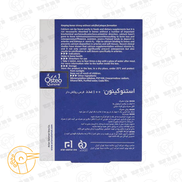 استئوکینون یک مکمل غذایی بدون گلوتن، شکر، تراریخته و نگهدارنده است که برای حفظ سلامت استخوانها و پیشگیری از پوکی استخوان تولید میشود. ترکیبات قرص استئوکینون شامل سه ماده مهم شامل کلسیم (به شکل کربنات کلسیم 250 میلیگرم)، ویتامین D3 (کولهکلسیفرول 200 واحد بینالمللی) و ویتامین K2-7 (به مقدار 45 میکروگرم) است که بهعنوان بخشی از برنامه تغذیهای یا درمانی برای حمایت از سلامت استخوان در گروههای مختلف سنی و شرایط خاص مورد استفاده قرار میگیرد.